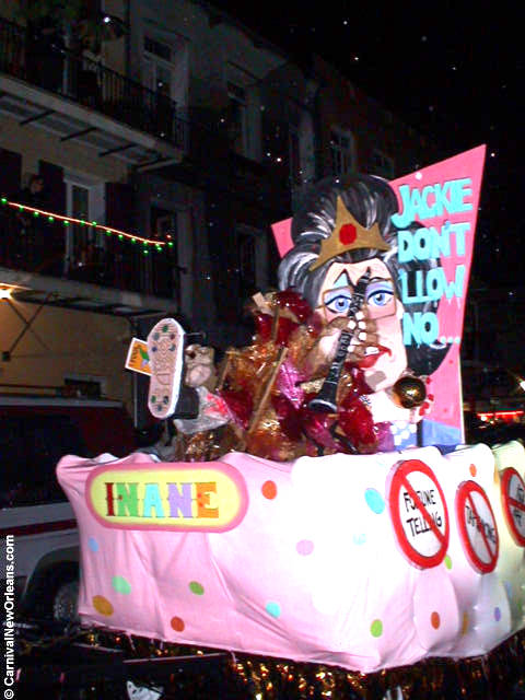 Local councilwoman Jackie Clarkson earned herself a float in KDV as a result of her push to remove benches from the Jackson Square area in an effort to curtail the indigenous homeless population who dwelled therein. She apparently felt the need to sit down around the park and St. Louis Cathedral was peripheral to the need to crack down on vagrants. She's become quite popular among the artist community for her rather misguided attempts to "clean up" the French Quarter.